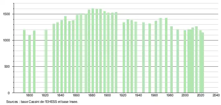 L'évolution du nombre d'habitants est connue à travers les recensements de la population effectués dans la commune depuis 1793. Pour les communes de moins de 10 000 habitants, une enquête de recensement portant sur toute la population est réalisée tous les cinq ans, les populations de référence des années intermédiaires étant quant à elles estimées par interpolation ou extrapolation[20]. Pour la commune, le premier recensement exhaustif entrant dans le cadre du nouveau dispositif a été réalisé en 2004[21].