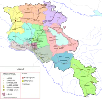 L'Arménie compte 46 municipalités désignées comme communautés urbaines en 2017. Cependant, une ville/village en Arménie n'est pas défini en fonction de la taille de sa population. Les 457 autres municipalités d'Arménie sont considérées comme des communautés rurales. Les deux tiers de la population sont désormais urbanisés. Statistiquement, 63,6 % des Arméniens vivent dans des zones urbaines, contre 36,4 % dans des zones rurales, en 2017. Erevan, Gyumri et Vanadzor sont les trois plus grandes agglomérations urbaines de la république, comptant actuellement plus de 50 000 habitants. Elles étaient considérées comme des « villes de subordination républicaine » pendant la période soviétique. Les autres villes comptent moins de 50 000 habitants.