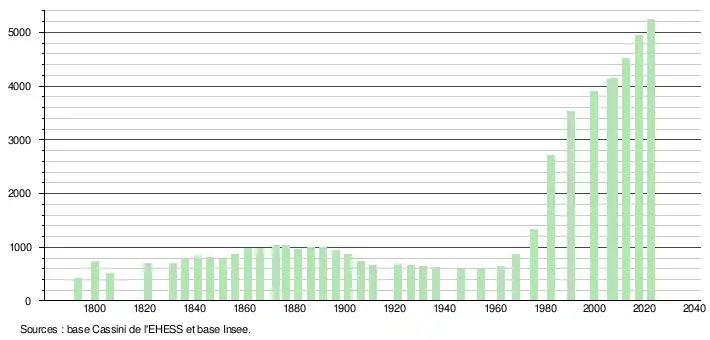 L'évolution du nombre d'habitants est connue à travers les recensements de la population effectués dans la commune depuis 1793. Pour les communes de moins de 10 000 habitants, une enquête de recensement portant sur toute la population est réalisée tous les cinq ans, les populations de référence des années intermédiaires étant quant à elles estimées par interpolation ou extrapolation[19]. Pour la commune, le premier recensement exhaustif entrant dans le cadre du nouveau dispositif a été réalisé en 2007[20].