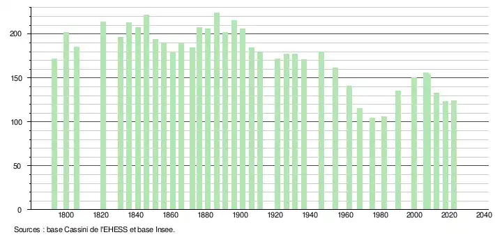 L'évolution du nombre d'habitants est connue à travers les recensements de la population effectués dans la commune depuis 1793. Pour les communes de moins de 10 000 habitants, une enquête de recensement portant sur toute la population est réalisée tous les cinq ans, les populations de référence des années intermédiaires étant quant à elles estimées par interpolation ou extrapolation[20]. Pour la commune, le premier recensement exhaustif entrant dans le cadre du nouveau dispositif a été réalisé en 2007[21].