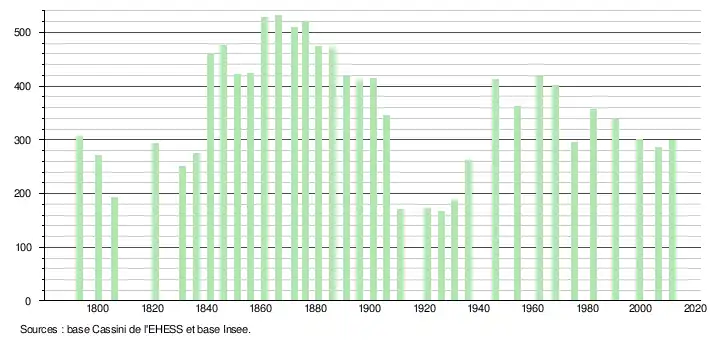 L'évolution du nombre d'habitants est connue à travers les recensements de la population effectués dans la commune depuis 1793. À partir du , les populations légales des communes sont publiées annuellement dans le cadre d'un recensement qui repose désormais sur une collecte d'information annuelle, concernant successivement tous les territoires communaux au cours d'une période de cinq ans. Pour les communes de moins de 10 000 habitants, une enquête de recensement portant sur toute la population est réalisée tous les cinq ans, les populations légales des années intermédiaires étant quant à elles estimées par interpolation ou extrapolation[7]. Pour la commune, le premier recensement exhaustif entrant dans le cadre du nouveau dispositif a été réalisé en 2006[8],[Note 1].