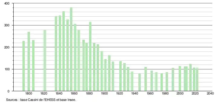 L'évolution du nombre d'habitants est connue à travers les recensements de la population effectués dans la commune depuis 1793. Pour les communes de moins de 10 000 habitants, une enquête de recensement portant sur toute la population est réalisée tous les cinq ans, les populations de référence des années intermédiaires étant quant à elles estimées par interpolation ou extrapolation[13]. Pour la commune, le premier recensement exhaustif entrant dans le cadre du nouveau dispositif a été réalisé en 2008[14].