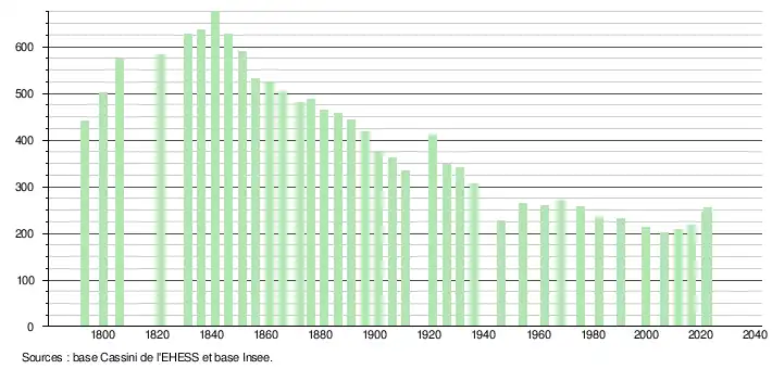 L'évolution du nombre d'habitants est connue à travers les recensements de la population effectués dans la commune depuis 1793. Pour les communes de moins de 10 000 habitants, une enquête de recensement portant sur toute la population est réalisée tous les cinq ans, les populations de référence des années intermédiaires étant quant à elles estimées par interpolation ou extrapolation[20]. Pour la commune, le premier recensement exhaustif entrant dans le cadre du nouveau dispositif a été réalisé en 2006[21].