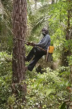 - Couper, en haut de l'arbre, une partie de la spathe (pièce florale en forme de feuille), puis à pratiquer des incisions horizontales sur la tige de la spadice, le bourgeon terminal (une inflorescence en forme d'épi), d'où la sève s'écoule vers un entonnoir en feuilles de palmier, qui fait couler la sève dans une bouteille. Plusieurs fois par jour l’entaille est rouverte pour débloquer le flux de sève; un arbre peut produire plusieurs litres par jour. Cette technique permet une récolte pendant un mois, mais c'est une activité qui présente un risque car elle oblige à monter plusieurs fois par jour en haut des palmiers et les chutes ne sont pas rares (souvent par manque de mesure de sécurité élémentaire). Un arbre ainsi traité ne fera pas de fruit pendant la saison[3].