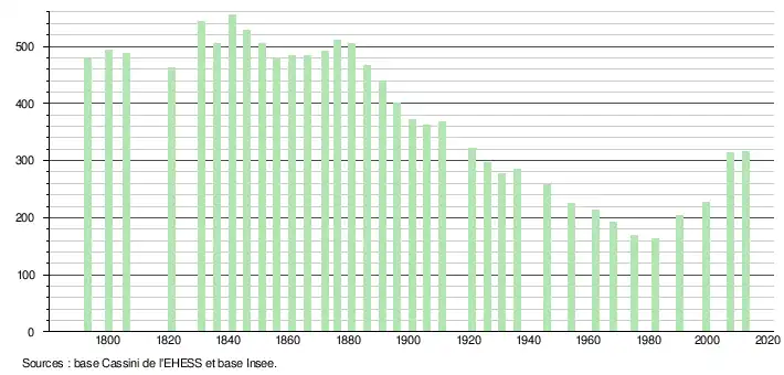 - ↑ Par convention dans Wikipédia, le principe a été retenu de n’afficher dans le tableau des recensements et le graphique, pour les populations légales postérieures à 1999, que les populations correspondant à une enquête exhaustive de recensement pour les communes de moins de 10 000 habitants, et que les populations des années 2006, 2011, 2016, etc. pour les communes de plus de 10 000 habitants, ainsi que la dernière population légale publiée par l’Insee pour l'ensemble des communes.