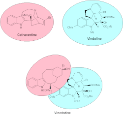 La vincristine dérive d'un couplage entre deux alcaloïdes: la catharanthine et la vindoline, tous deux présents dans la pervenche de Madagascar mais en concentration plus importante que la vincristine. En effet, 1 kg de feuilles séchées de pervenche contient seulement 10 mg de vincristine contre 1 g/kg pour la vindoline et 300 mg/kg pour la catharanthine. On utilise donc préférentiellement[3] le couplage lors de la biosynthèse et de la synthèse de la vincristine, le but étant d'obtenir le meilleur rendement. Ces deux procédés sont assez similaires.