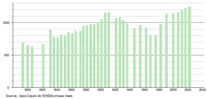 L'évolution du nombre d'habitants est connue à travers les recensements de la population effectués dans la commune depuis 1793. Pour les communes de moins de 10 000 habitants, une enquête de recensement portant sur toute la population est réalisée tous les cinq ans, les populations de référence des années intermédiaires étant quant à elles estimées par interpolation ou extrapolation[27]. Pour la commune, le premier recensement exhaustif entrant dans le cadre du nouveau dispositif a été réalisé en 2006[28].