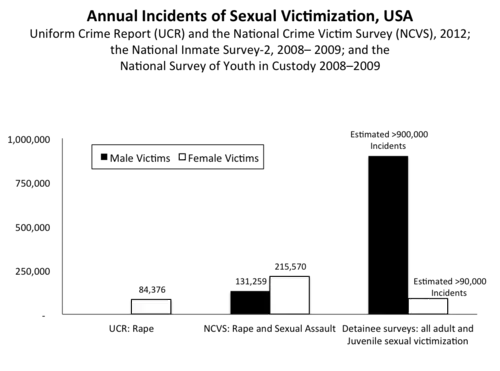 - « D'après les estimations, 4,4 % des détenus en prison et 3,1 % et des détenus en pénitencier ont rapporté avoir été victimisés sexuellement par un autre détenu ou un membre du personnel dans les derniers 12 mois ou depuis l'entrée dans l'établissement, si cela fait moins de 12 mois. »