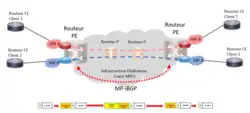 Le MultiProtocole BGP (MP-BGP) est une extension au protocole de routage BGP qui permet à différentes familles d’adresses d’être distribuées en parallèle entre routeurs (en l'occurrence pour les L3VPN : adresses VPN IPv4/v6 avec labels MPLS). Les routeurs d'un réseau MPLS communiquent ainsi en i-MP-BGP (interior MultiProtocol BGP).