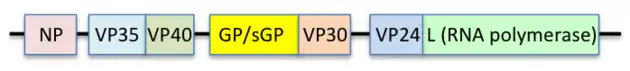 Le génome du virus Ebola, long d'environ 19 kilobases, comporte sept gènes qui codent sept protéines structurelles et deux protéines sécrétées supplémentaires par un phénomène de polymerase stuttering : nucléoprotéine de la capside NP, le cofacteur de la polymérase virale VP35, la protéine de matrice majeure VP40, les glycoprotéines GP, sGP et ssGP issues du gène GP, la nucléoprotéine mineure VP30, la protéine de matrice VP24 et l'ARN polymérase ARN-dépendante L[18].