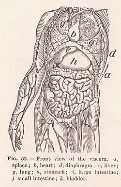 Planche anatomique présentant des viscères humains : appareil digestif (intestins, estomac, etc.), poumons, cœur, etc.