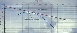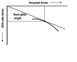 La figure ci-contre représente la polaire des vitesses d'un planeur. L'abscisse correspond à la vitesse-air de l'aéronef et l'ordonnée correspond à la vitesse de chute. Le plané sera le meilleur possible lorsque l'angle de plané sera le plus petit possible ; angle minimal obtenu lorsque la droite d'origine O est tangente à la courbe de la polaire[1],[2].