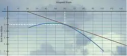 Il est souvent dit que lorsqu'on rencontre une descendance, ou qu'on vole avec un vent de face, il faut « pousser sur le manche ». La figure ci-contre indique comment calculer la vitesse optimale d'un planeur lorsqu'il vole dans une descendance. On peut considérer que la polaire est translatée vers le bas et donc la méthode décrite ci-dessus pourrait encore s'appliquer. Toutefois, il est plus simple de ne pas bouger la polaire et relever l'origine de la courbe tangente de la vitesse de subsidence de la masse d'air. Dans la figure-ci contre, on suppose que la masse d'air descend à la vitesse de 3 nœuds et donc on calcule la courbe d'origine +3 nœuds qui est tangente à la polaire[1],[3].