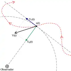 Le mouvement d'un objet par rapport à un observateur peut être décomposé en deux axes orthogonaux : radial et tangentiel. La vitesse radiale (vr) (VR(t) sur le graphique) ne donne donc pas la valeur du vecteur vitesse de l'objet (vs) (V(t) sur le graphique), mais uniquement la composante de celui-ci sur la ligne de visée. La vitesse radiale est donc vr = vs cos θ, où θ est l'angle formé par la ligne de visée vers le mobile et la trajectoire de celui-ci.