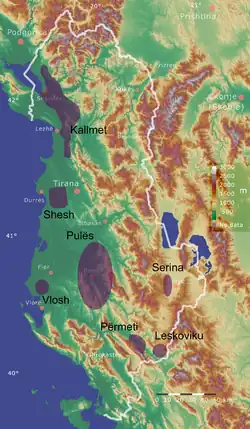 L'Albanie est actuellement divisée en quatre grandes régions viticoles en fonction de ses terroirs. La première est la plaine côtière, d'une altitude maximale de 300 mètres. Elle inclut les villes de Tirana, Durrës, Shkodra, Lezhë, Lushnjë, Fier, Vlora et Delvinë. Vient ensuite, la région vallonnée qui s'étage entre 300 et 600 mètres et qui comprend Elbasan, Krujë, Gramsh, Berat, Përmet, Librazhd et Mirdita. La troisième région viticole est un piémont dont l'altitude varie entre 600 et 800 mètres ; là se situent les villes de Pogradec, Korçë, Leskovik et Peshkopi. Sur la partie montagneuse, le vignoble est cultivé jusqu'à mille mètres, il prospère sur des sols argilo-siliceux de profondeurs et d'expositions variées[1].