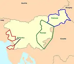 La Slovénie est divisée en trois régions viticoles : la vallée de la Drave (Podravje), la vallée de la Save (Posavje) et la Primorska, région de la côte adriatique. Elles se subdivisent en fonction du terroir et de ses éléments constitutifs (climat, sols, etc.)[1] en neuf sous-régions : Goriška Brda, Vipavska dolina, Kras, Istra, Bela krajina, Dolenjska, Bizeljsko, Štajerska et Prekmurje[4].