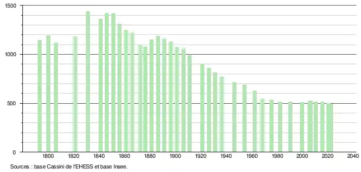 L'évolution du nombre d'habitants est connue à travers les recensements de la population effectués dans la commune depuis 1793. Pour les communes de moins de 10 000 habitants, une enquête de recensement portant sur toute la population est réalisée tous les cinq ans, les populations de référence des années intermédiaires étant quant à elles estimées par interpolation ou extrapolation[34]. Pour la commune, le premier recensement exhaustif entrant dans le cadre du nouveau dispositif a été réalisé en 2005[35].