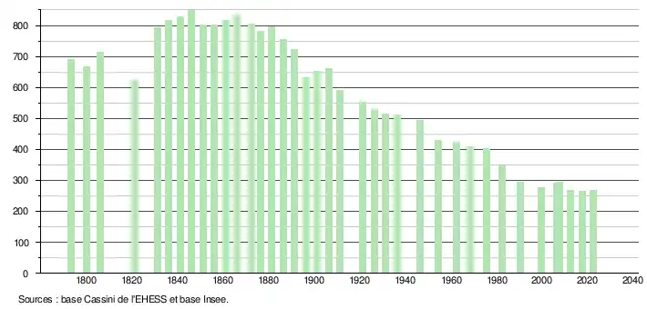 L'évolution du nombre d'habitants est connue à travers les recensements de la population effectués dans la commune depuis 1793. Pour les communes de moins de 10 000 habitants, une enquête de recensement portant sur toute la population est réalisée tous les cinq ans, les populations de référence des années intermédiaires étant quant à elles estimées par interpolation ou extrapolation[12]. Pour la commune, le premier recensement exhaustif entrant dans le cadre du nouveau dispositif a été réalisé en 2007[13].