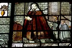 Inscription : CETTE VITRE A ETE DONNEE PAR MAITRE AUDIFER LE JOUR DE L'AN 1614 (panneau du donateur, en bas) ; 1860 (bordure, en haut) ; M., V. et A. entrelacés (sur la bordure, 2 fois).