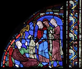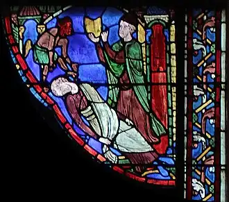 Un groupe de trois personnages présente le suaire à Philétus, toujours gisant à terre mais qui se redresse à présent. Au-dessus de lui, un diablotin jaune s'échappe, tenant sa tête entre ses mains. L'ouverture rouge derrière lui semble ici être une cheminée, évoquant probablement la porte de l'enfer vers lequel le diablotin va repartir. Ici, l'artiste interprète nettement le « suaire » comme une chemise, allusion probable à la relique de la tunique de la Vierge conservée à Chartres. |