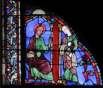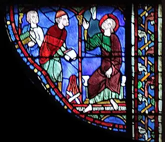 Jacques est assis sur un rocher dominant la mer, qui figure peut-être les côtes de la Galice où Jacques est réputé avoir enseigné[2], ou peut-être encore le rocher de Gibraltar, qui marquait traditionnellement « les extrémités de la Terre » où les apôtres avaient été envoyés pour prêcher la bonne nouvelle (Mc 16:15). À ses pieds, le bandeau brun précise en grisaille « S I ACOBUS ». Le christ est reconnaissable à la croix marquant son nimbe, caractéristique des personnes divines. Il tend à Jacques un bâton, et fait de la main droite un geste marquant l'autorité dans l'enseignement. Derrière lui, un ange tient un morceau de pain pour la route. La scène est allégorique, et souligne l'importance du pèlerinage de Saint Jacques de Compostelle au XIIIe siècle, dont Chartres était une étape. |