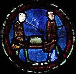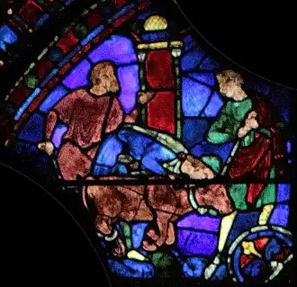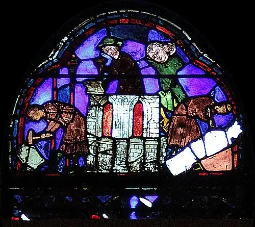 À gauche, deux manœuvres transportent un bloc de pierre sur un brancard. D'après l'iconographie représentant les chantiers de l'époque, la brouette serait apparue dans la seconde moitié du XIIIe siècle, une cinquantaine d'années après la construction de la cathédrale et la réalisation de ce vitrail.