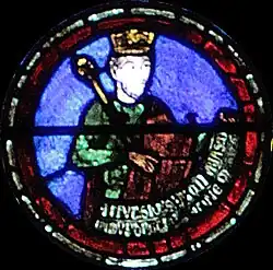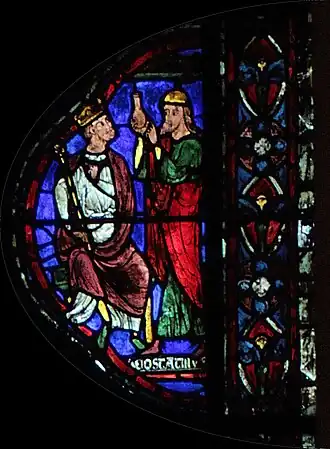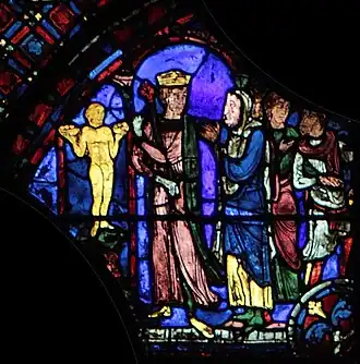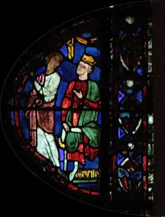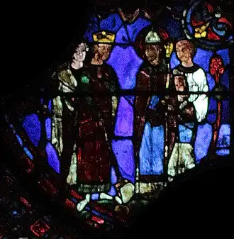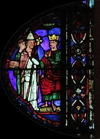 Charlemagne, dont le vitrail fait le pendant de celui-ci dans le déambulatoire nord, marquera ultérieurement une étape ultérieure pour l'occident au VIIIe siècle : c'est par sa dynastie que l'onction a été systématiquement introduite dans le sacre royal, manifestant un basculement dans la légitimité du pouvoir ; par son sacre religieux, le Roi tient son ministère de Dieu (par l’intermédiaire de l’Église), il a pour vocation à ce titre d'être le bras armé de l’Église dans le monde, consacrant la « conception ministérielle de la royauté »[4]. Ces deux vitraux illustrent donc le rapport entre l'autorité spirituelle de l'Église et l'autorité temporelle du souverain au XIIIe siècle, tel qu'il était enseigné par l'Église. Par la suite, la donation de Constantin, apparaissant vers le IXe siècle et dont le caractère inauthentique ne sera établi qu'au XVe siècle, tente de faire remonter cette conception à Constantin lui-même, qui par ce testament inventé sous les carolingiens aurait légué son pouvoir temporel à l'autorité de l'Église.