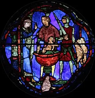 Deux soldats, l'épée dégainée, s'apprêtent à frapper. À droite, un groupe d'enfants s'avance, les mains liées derrière le dos. Un enfant est déjà dans la cuve, un autre est assis au pied de celle-ci, les jambes en tailleur et les bras croisés. Tous semblent étrangement calmes.
