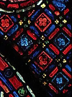 Le fond est orné d'une mosaïque à résille oblique[1] complexe de carrés décorés en grisaille d'une fleur quadrilobée et d'une bordure, carrés alternativement bleus bordés d'un filet rouge, et rouges bordés d'un filet bleu. Les filets sont ponctués de perles ornés d'une fleur quadrilobée en grisaille, jaune aux coins des carrés rouge, et verte aux coins des carrés bleus.