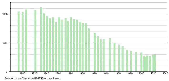 L'évolution du nombre d'habitants est connue à travers les recensements de la population effectués dans la commune depuis 1793. Pour les communes de moins de 10 000 habitants, une enquête de recensement portant sur toute la population est réalisée tous les cinq ans, les populations de référence des années intermédiaires étant quant à elles estimées par interpolation ou extrapolation[18]. Pour la commune, le premier recensement exhaustif entrant dans le cadre du nouveau dispositif a été réalisé en 2004[19].