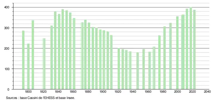 L'évolution du nombre d'habitants est connue à travers les recensements de la population effectués dans la commune depuis 1793. Pour les communes de moins de 10 000 habitants, une enquête de recensement portant sur toute la population est réalisée tous les cinq ans, les populations de référence des années intermédiaires étant quant à elles estimées par interpolation ou extrapolation[18]. Pour la commune, le premier recensement exhaustif entrant dans le cadre du nouveau dispositif a été réalisé en 2007[19].