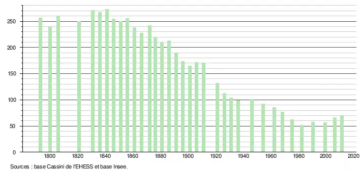 - ↑ Par convention dans Wikipédia, le principe a été retenu de n’afficher dans le tableau des recensements et le graphique, pour les populations légales postérieures à 1999, que les populations correspondant à une enquête exhaustive de recensement pour les communes de moins de 10 000 habitants, et que les populations des années 2006, 2011, 2016, etc. pour les communes de plus de 10 000 habitants, ainsi que la dernière population légale publiée par l’Insee pour l'ensemble des communes.