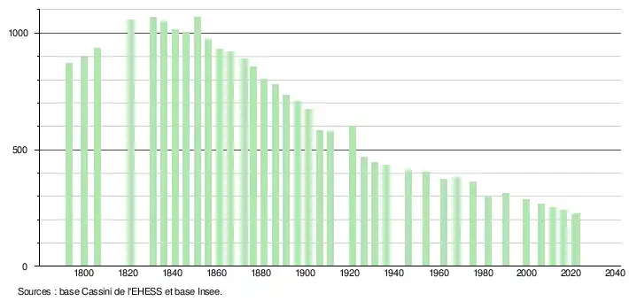 L'évolution du nombre d'habitants est connue à travers les recensements de la population effectués dans la commune depuis 1793. Pour les communes de moins de 10 000 habitants, une enquête de recensement portant sur toute la population est réalisée tous les cinq ans, les populations de référence des années intermédiaires étant quant à elles estimées par interpolation ou extrapolation[16]. Pour la commune, le premier recensement exhaustif entrant dans le cadre du nouveau dispositif a été réalisé en 2006[17].