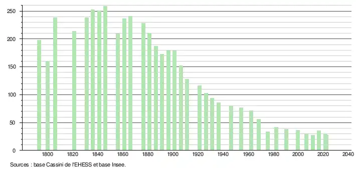 L'évolution du nombre d'habitants est connue à travers les recensements de la population effectués dans la commune depuis 1793. Pour les communes de moins de 10 000 habitants, une enquête de recensement portant sur toute la population est réalisée tous les cinq ans, les populations de référence des années intermédiaires étant quant à elles estimées par interpolation ou extrapolation[30]. Pour la commune, le premier recensement exhaustif entrant dans le cadre du nouveau dispositif a été réalisé en 2006[31].