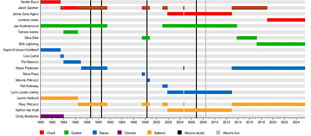 - Janet Gardner – chant et guitare rythmique, tambourine (1983–1991, 1997–1998, 2001, 2004, 2012–2013, 2013–2019)