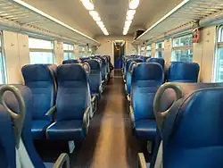 Intérieur d'une voiture MDVE de deuxième classe rénovée.