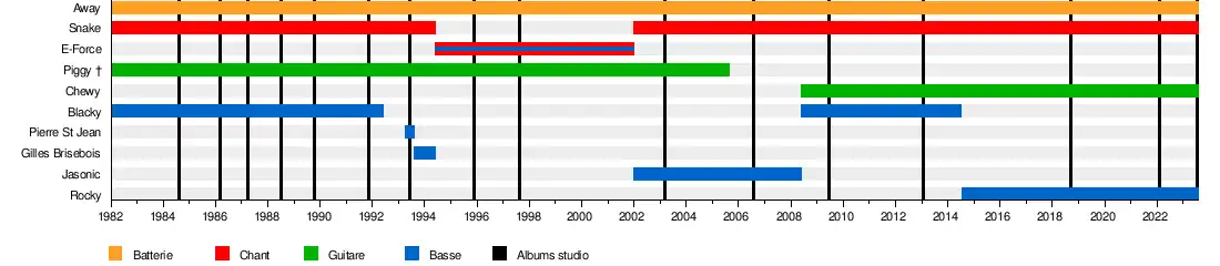 • Michel Langevin (Away) - batterie (depuis 1982)