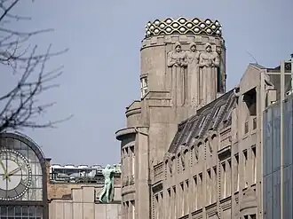 - les trois personnages de la couronne du Palais de la Koruna sur la place Venceslas à Prague, 1912–1914 ;