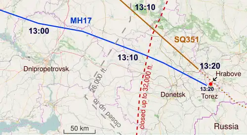 Le trajet du vol MH17 le diffère de ceux empruntés les jours précédents qui visaient à éviter le survol des zones de conflit[18] : l'avion, en empruntant un couloir aérien plus au nord, et ce pour une raison que l'enquête n'a pas encore mise au jour, survole la zone où s'affrontent les combattants de la république populaire de Donetsk (RPD) et l'armée ukrainienne (ZSU).