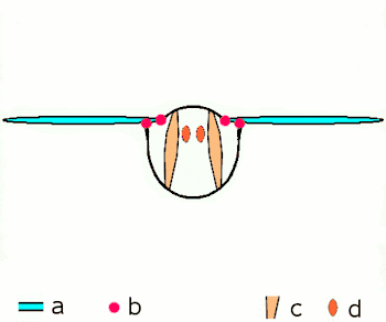 Les muscles dorso-ventraux (c) dont la contraction provoque le relèvement de la paire d'ailes (a), et les muscles dorsaux longitudinaux (d)[4] dont la contraction entraîne un raccourcissement du segment thoracique arquant le tergite et provoquant l'abaissement des ailes, ne sont plus insérés sur les sclérites alaires (b).