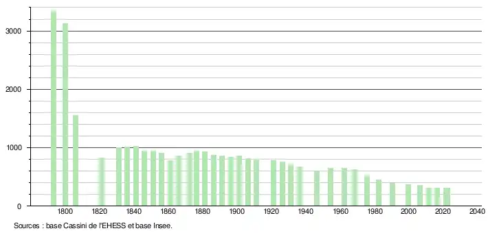 L'évolution du nombre d'habitants est connue à travers les recensements de la population effectués dans la commune depuis 1793. Pour les communes de moins de 10 000 habitants, une enquête de recensement portant sur toute la population est réalisée tous les cinq ans, les populations de référence des années intermédiaires étant quant à elles estimées par interpolation ou extrapolation[25]. Pour la commune, le premier recensement exhaustif entrant dans le cadre du nouveau dispositif a été réalisé en 2006[26].