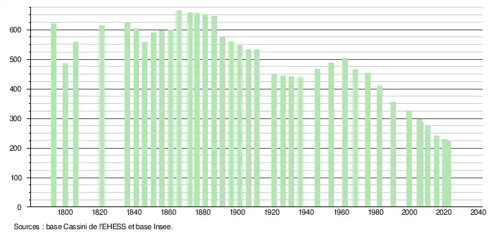 L'évolution du nombre d'habitants est connue à travers les recensements de la population effectués dans la commune depuis 1793. Pour les communes de moins de 10 000 habitants, une enquête de recensement portant sur toute la population est réalisée tous les cinq ans, les populations de référence des années intermédiaires étant quant à elles estimées par interpolation ou extrapolation[12]. Pour la commune, le premier recensement exhaustif entrant dans le cadre du nouveau dispositif a été réalisé en 2005[13].