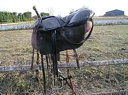 - La croix, le cavalier s'assoit sur un des deux étriers et met ses bras en croix ; cela permettait au cavalier de tirer derrière lui.