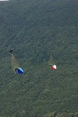 Hélicoptère : figure d'acrobatie (voltige) pendant laquelle le pilote maintient la rotation de son aile autour d'un axe vertical. Cette fois-ci, la partie décrochée est maintenue en parachutale stabilisée, avec son profil encore à peu près gonflé, alors que dans la vrille la partie interne décroche franchement avec un aspect caractéristique de serpillière et de forts mouvements en tangage de cette demi-aile. L'hélicoptère est une figure de voltige alors que la vrille est plus un incident de vol.