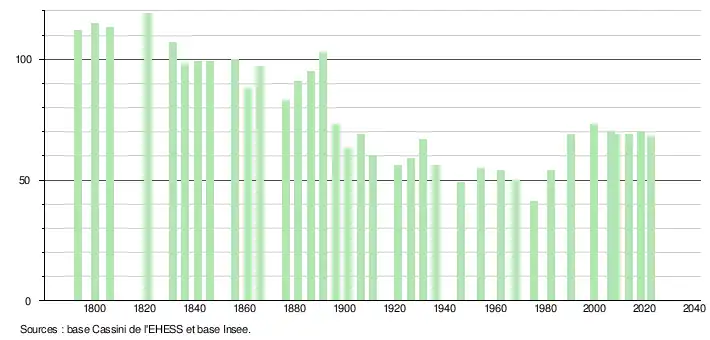 L'évolution du nombre d'habitants est connue à travers les recensements de la population effectués dans la commune depuis 1793. Pour les communes de moins de 10 000 habitants, une enquête de recensement portant sur toute la population est réalisée tous les cinq ans, les populations de référence des années intermédiaires étant quant à elles estimées par interpolation ou extrapolation[25]. Pour la commune, le premier recensement exhaustif entrant dans le cadre du nouveau dispositif a été réalisé en 2008[26].