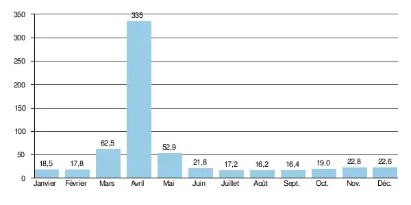 Le débit moyen mensuel observé en août (minimum d'étiage) est de 16,2 m3/s, soit quelque 5 % du débit moyen du mois d'avril (335 m3/s), ce qui montre l'amplitude très importante des variations saisonnières. Sur la durée d'observation de 49 ans, le débit mensuel minimal a été de 5,76 m3/s (en ), tandis que le débit mensuel maximal s'élevait à 747 m3/s ().