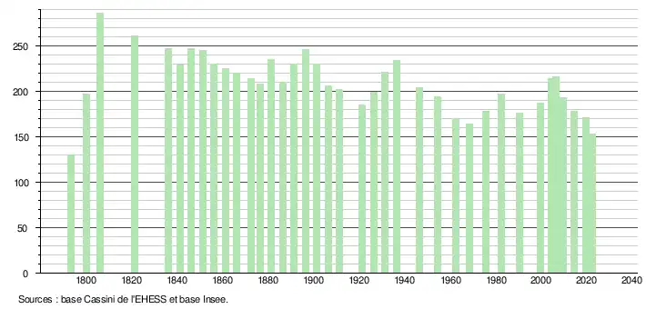L'évolution du nombre d'habitants est connue à travers les recensements de la population effectués dans la commune depuis 1793. Pour les communes de moins de 10 000 habitants, une enquête de recensement portant sur toute la population est réalisée tous les cinq ans, les populations de référence des années intermédiaires étant quant à elles estimées par interpolation ou extrapolation[13]. Pour la commune, le premier recensement exhaustif entrant dans le cadre du nouveau dispositif a été réalisé en 2004[14].