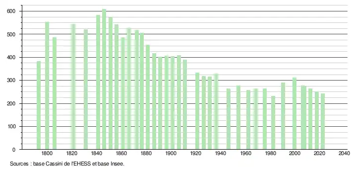 L'évolution du nombre d'habitants est connue à travers les recensements de la population effectués dans la commune depuis 1793. Pour les communes de moins de 10 000 habitants, une enquête de recensement portant sur toute la population est réalisée tous les cinq ans, les populations de référence des années intermédiaires étant quant à elles estimées par interpolation ou extrapolation[34]. Pour la commune, le premier recensement exhaustif entrant dans le cadre du nouveau dispositif a été réalisé en 2007[35].