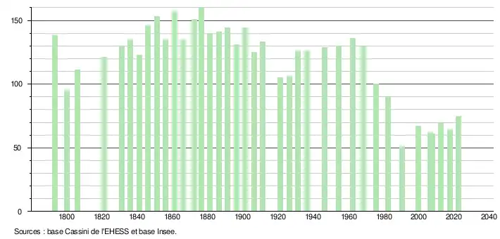 L'évolution du nombre d'habitants est connue à travers les recensements de la population effectués dans la commune depuis 1793. Pour les communes de moins de 10 000 habitants, une enquête de recensement portant sur toute la population est réalisée tous les cinq ans, les populations de référence des années intermédiaires étant quant à elles estimées par interpolation ou extrapolation[40]. Pour la commune, le premier recensement exhaustif entrant dans le cadre du nouveau dispositif a été réalisé en 2007[41].