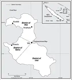 Espace non coutumier, Wé était partagé entre trois tribus appartenant aux trois districts : Qanono pour Gaica, Luecila pour Wetr et Hnase pour Lossi. C'était le lieu traditionnel des affrontements tribaux, jusqu'à l'évangélisation de l'île au milieu du XIXe siècle. C'est à Wé que l'évangéliste des îles Cook, Fao fonda la première mission protestante. C'est également l'une des raisons pour lesquelles ce terrain fut accordé aux Européens pour l'implantation de leur centre administratif.